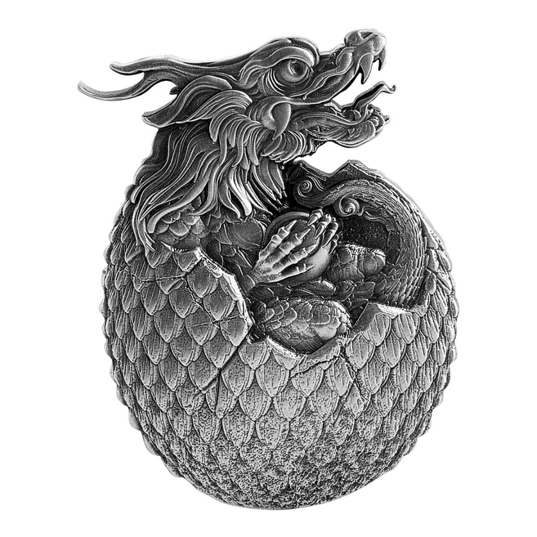 Редкое и желанное изделие, изготовленное из чистого серебра 999 пробы весом 2 унции и высеченное с высокой точностью, яйцо китайского дракона станет изысканным подарком для новых начинаний и поводов. Коллекционеры драгоценных металлов в слитках оценят сложную гравировку, выполненную в сверхвысоком рельефе и украшенную отделкой из состаренного серебра. Размеры 35 на 45 мм, выпущено ограниченным тиражом всего в 500 штук.