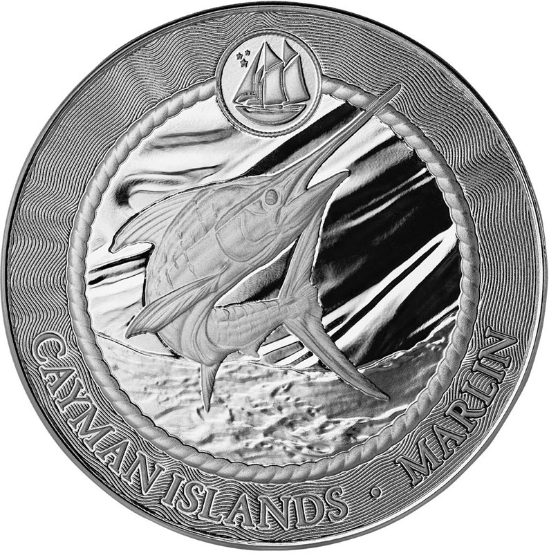 На реверсе изображён марлин, выпрыгивающий из воды. Вверху, в круге, изображен парусник и три звезды герба Каймановых островов. Внизу вдоль канта надпись: CAYMAN ISLANDS · MARLIN (страна-эмитент, марлин).