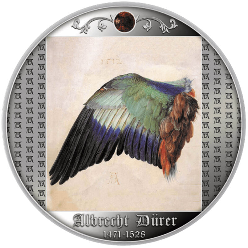 На реверсе изображена репродукция картины Альбрехта Дюрера «Крыло синебрюхой сизоворонки». Над крылом: 1512 (год создания), под ним: AD. Слева и справа фон из монограмм Дюрера: AD. Вверху вставка из янтаря, внизу надпись: Albrecht Dürer 1471-1528 (Альбрехт Дюрер, годы жизни).