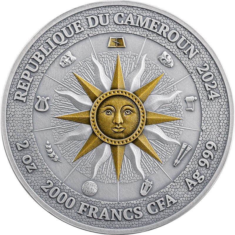 На аверсе изображено Солнце в окружении символических атрибутов каждой музы. У дощечки с палочкой выборочное золочение. Вдоль канта надпись: REPUBLIQUE DU CAMEROUN 2025 2 OZ 2000 FRANCS CFA Ag 999 (страна-эмитент, год чеканки, номинал, вес и проба серебра).