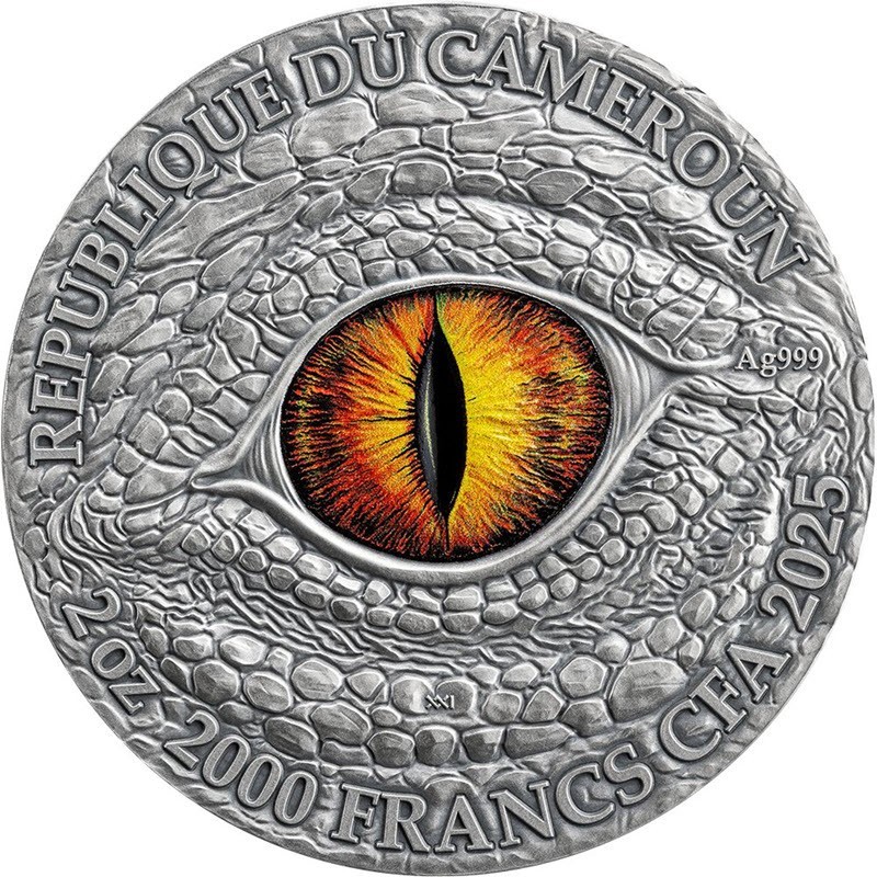 На аверсе изображен глаз гидры огненного цвета. Под ним: XXI (монограмма польского монетного двора). Вверху вдоль канта надпись: REPUBLIQUE DU CAMEROUN (страна-эмитент), внизу: 2 OZ 2000 FRANCS CFA 2025 Ag 999 (вес и проба серебра, номинал, год чеканки).