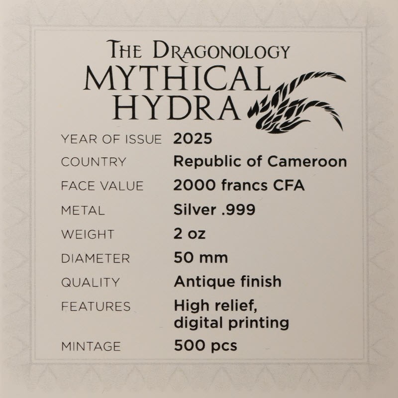 На реверсе изображена гидра с огненными глазами с девушкой, облаченной в эфирные одежды, которая олицетворяет торжество красоты над грозными невзгодами. Внизу надпись: MYTHICAL HYDRA.