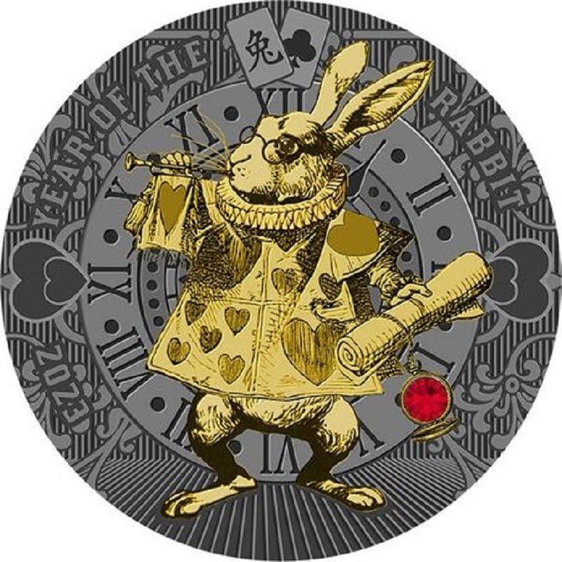 На реверсе монеты изображен милый Кролик в платье с сердечками и елизаветинским воротником. Животное позолочено, одной рукой оно держит пергамент, а другой играет на трубе. На заднем плане часы. По всему ободу замысловатый узор с сердечками и цветочными элементами и надписи: «Year of the Rabbit» — название монеты и «2023» — год выпуска.
