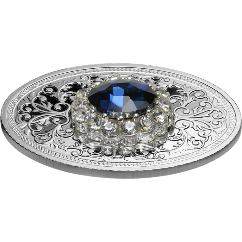 Эта удивительная серебряная монета овальной формы Польского монетного двора выполнена в виде броши со вставками из синего и белых кристаллов. Дизайн монеты был вдохновлен знаменитым помолвочным кольцом принцессы Дианы. Поверхность монеты имеет сложный филигранный узор. Тираж: 999 штук.