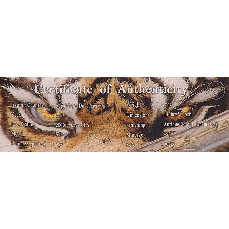 На аверсе вдоль кромки надпись: REPUBLIQUE DU CAMEROUN 2 oz Ag 999 • 2000 FRANCS CFA • 2025 (страна-эмитент, вес и проба серебра, номинал, год чеканки).