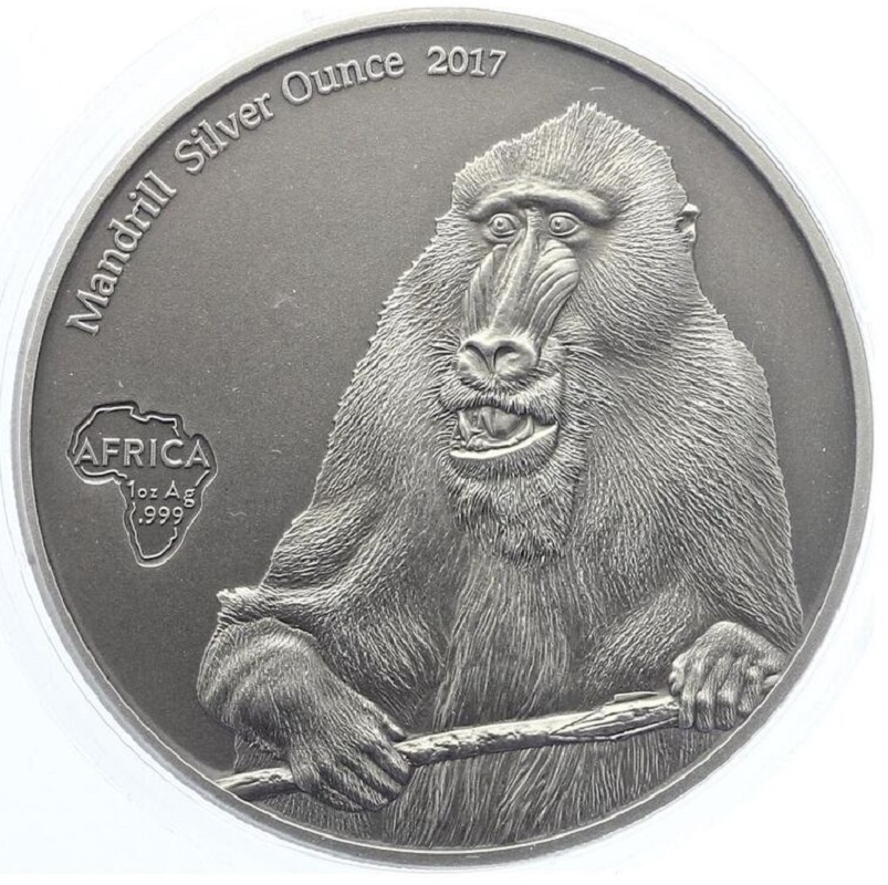 Изображение мандрила (примата из семейства мартышковых), держащий палку. Надпись Mandrill Silver Once 2017. Слева изображение африканского континента.