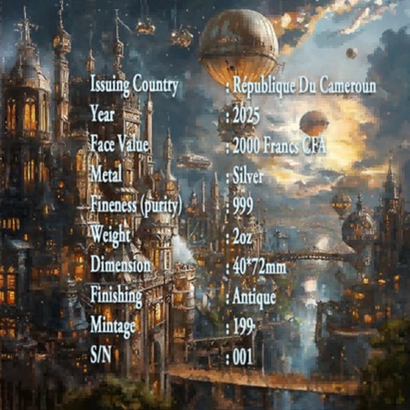 На аверсе на фоне механического орла изображен герб Камеруна. Вокруг герба надпись: REPUBLIQUE DU CAMEROUN 2 OZ Ag 999 2000 FRANCS CFA 2025 (страна-эмитент, вес и проба серебра, номинал, год чеканки).