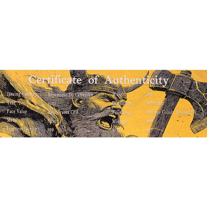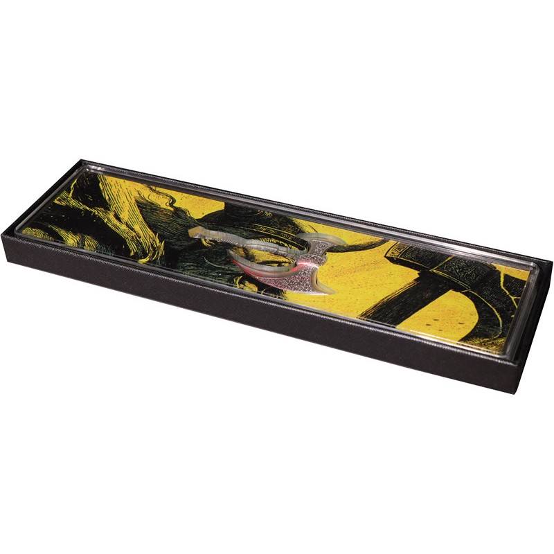 Эта прекрасная серебряная монета весом в 2 унции посвящена боевому топору. У нее размеры 46 Х 85 мм, качество античной отделки и селективное УФ-свечение. Поставляется в оригинальном футляре с сертификатом подлинности. Тираж: 349 штук.