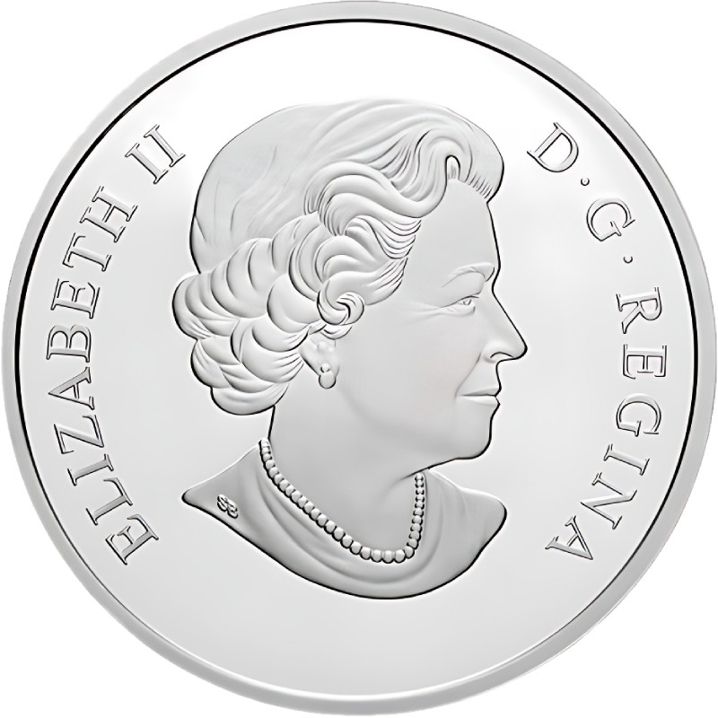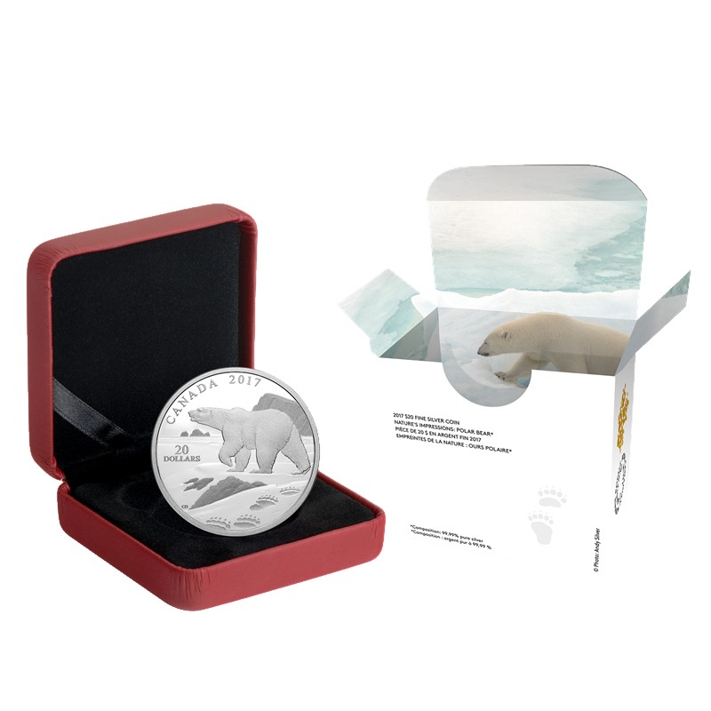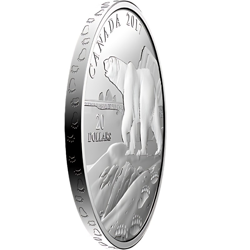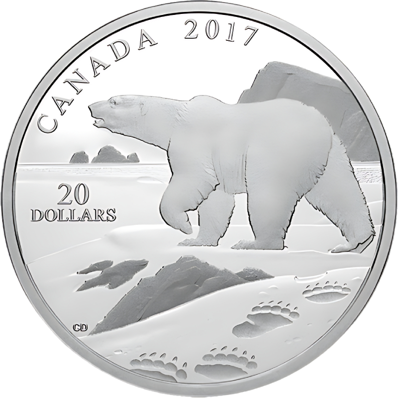 Серебряная монета Канадского монетного двора из серии «Впечатления природы» с изображением белого медведя на фоне арктического пейзажа, разработанное канадским художником Клаудио Д'Анджело (Claudio D'Angelo). Особенность монеты в том, что следы медведя, видимые на поверхности монеты, продолжаются в виде непрерывного рисунка по гурту монеты.