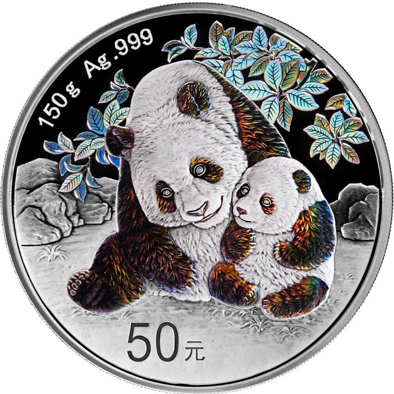 На реверсе изображены мать и детеныш гигантской панды на фоне камней и переливающихся листьев. Слева вверху надпись: 150 g Ag .999 (вес и проба серебра), внизу: 50 元 (номинал).