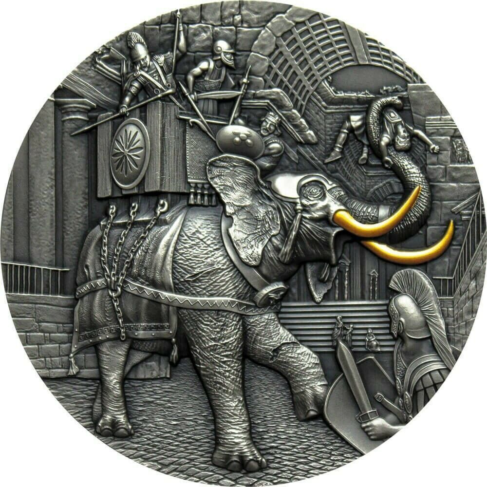 Эта серебряная монета весом в 2 унции посвящена одному из самых опасных видов оружия древнего мира: боевому слону. У монеты горельефы, выборочное золотое покрытие, античная отделка, она поставляется в витрине вместе с сертификатом подлинности. Ограниченный тираж всего 500 штук по всему миру!