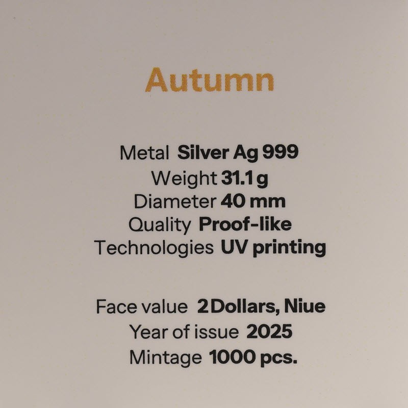 Эта чудесная серебряная монета от Литовского монетного двора – вторая из серии «Четыре времени года» - посвящена осени. Дизайнер Lucrezia Delfini. У нее качество пруф и селективная окраска. Поставляется в футляре с сертификатом подлинности. Тираж: 1000 штук.