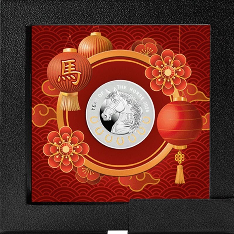 На реверсе изображена голова лошади. На шее иероглиф: 馬 (Лошадь). Вверху вдоль канта надпись: YEAR OF THE HORSE 2026. Внизу семь подков принесут вам удачу в течение всего Года Лошади.