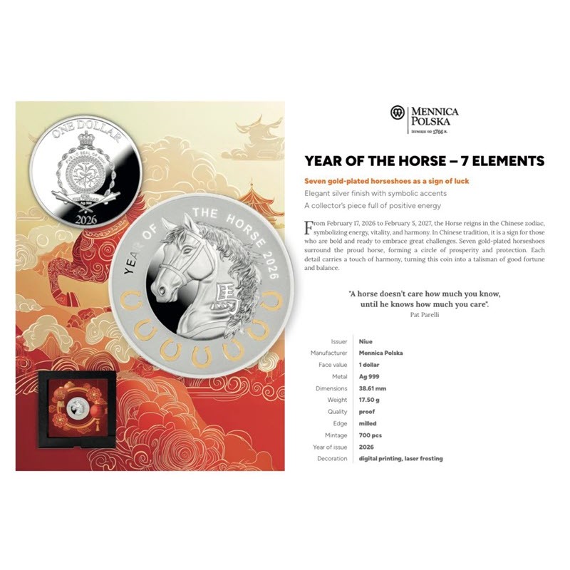 Серебряная монета от польского монетного двора Mint of Poland посвящена символу 2026 года - Лошади. У нее качество пруф и селективная окраска. Поставляется в оригинальном футляре с сертификатом подлинности. Тираж: 700 штук.