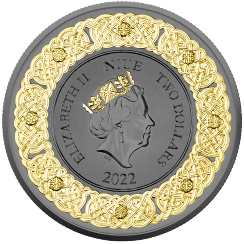 На аверсе изображена Ее Величество королева Елизавета II в бриллиантовой тиаре. Под портретом инициалы дизайнера Яна Рэнка-Бродли (IRB, Ian Rank-Broadley). Вокруг портрета надпись: ELIZABETH II NIUE TWO DOLLARS 2022 (Елизавета II, страна-эмитент, номинал, год чеканки). Вдоль канта кельтский орнамент.