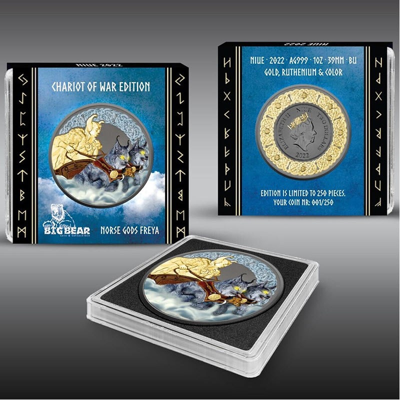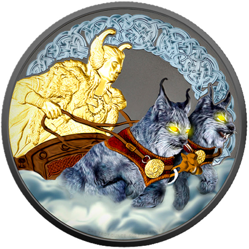 Эта чудесная серебряная монета весом в 1 унцию богине Фрейе. У нее выборочное золочение и покрытие рутением, селективная окраска. Поставляется в капсуле с сертификатом подлинности. Тираж: 250 штук.