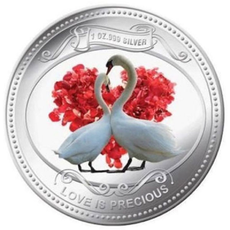 Цветная картинка с изображением пары лебедей на фоне цветочного сердца. Снизу название серии — Love is Precious. Сверху вес и чистота металла — 1oz 999 Silver