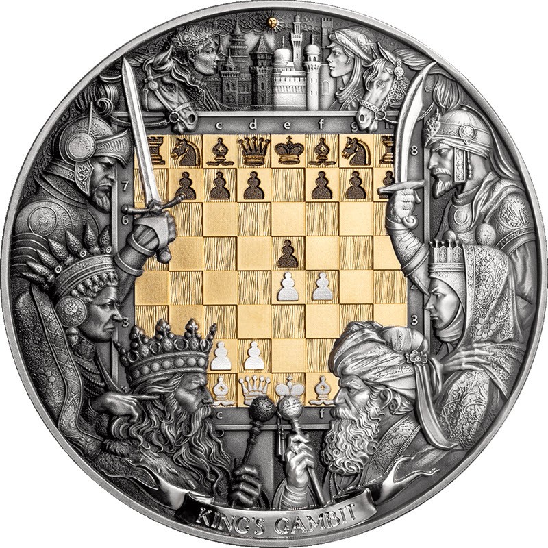 Серебряная монета весом в 3 унции из серии «Шахматная битва» посвящена Королевскому гамбиту, одному из самых острых и сложных дебютов. У нее качество античной отделки, прекрасный дизайн с высоким рельефом и выборочным золочением. Поставляется в футляре с сертификатом подлинности. Тираж: 333 штук.