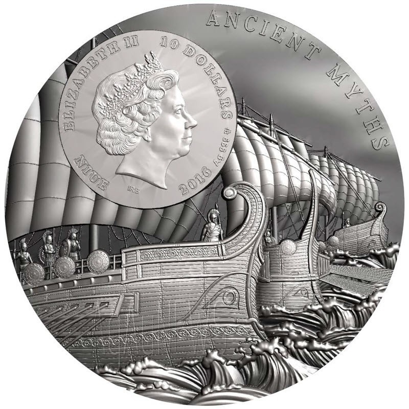 На аверсе изображены три греческие триремы под парусами с воинами на носу. Вверху надпись: ANCIENT MYTHS (серия). Слева портрет королевы Елизавета II в бриллиантовой тиаре. Под портретом королевы инициалы дизайнера IRB (Ian Rank Broadley). Вокруг королевы надпись: ELIZABETH II 10 DOLLARS NIUE 2016 Ag999 mw (Елизавета II, номинал, страна-эмитент, год чеканки, проба серебра, монограмма польского монетного двора). На гурте индивидуальный номер монеты.