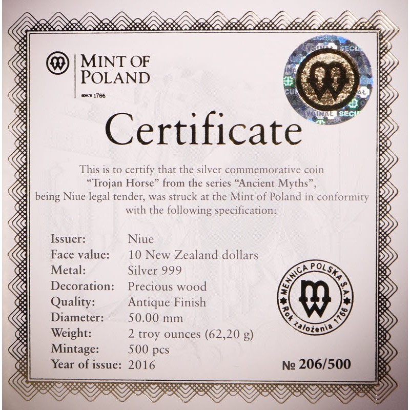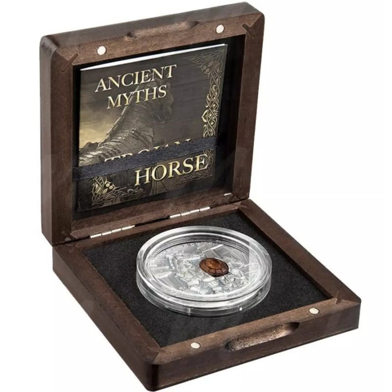 Эта удивительная серебряная монета весом в 2 унции – первая из серии «Древние мифы» и посвящена Троянскому коню. У нее качество античной отделки, высокий рельеф и вставка из отполированного дерева. Поставляется в деревянном футляре с сертификатом подлинности. Тираж: 500 штук.