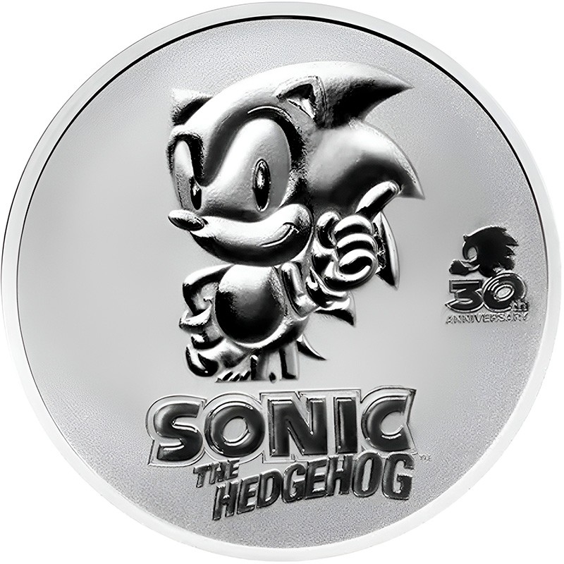 Эта чудесная 1 унцовая серебряная монета посвящена 30-летнему юбилею франшизы одного из самых известных персонажей игр Sega - антропоморфному ежу Сонику (Sonic the Hedgehog) с синими иголками, который противостоит злому и безумному ученому — доктору Эггману.