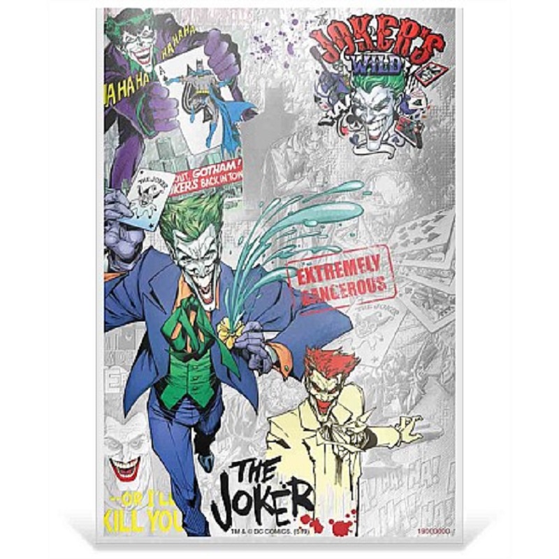 На этой первой уникальной банкноте из чистого серебра в коллекции злодеев BATMAN ™ изображен один из самых узнаваемых и популярных злодеев комиксов в истории поп-культуры — Джокер. В дизайне использованы фотомонтажи, которые ассоциируются с его любовью к хаосу, искусно сочетающие в себе как цвет, так и гравировку, позволяющую серебру сиять.