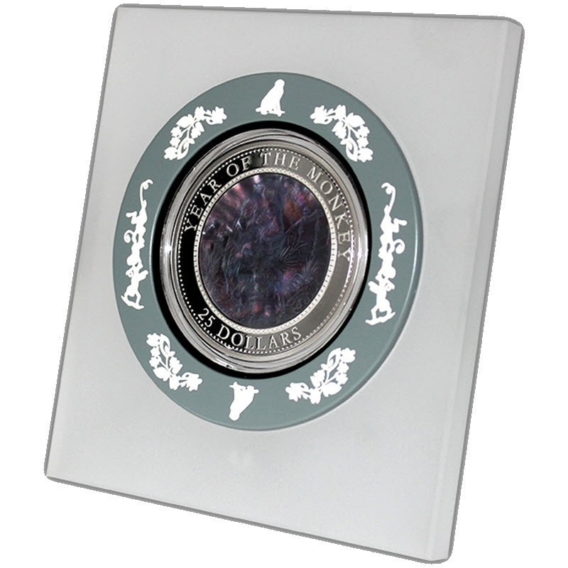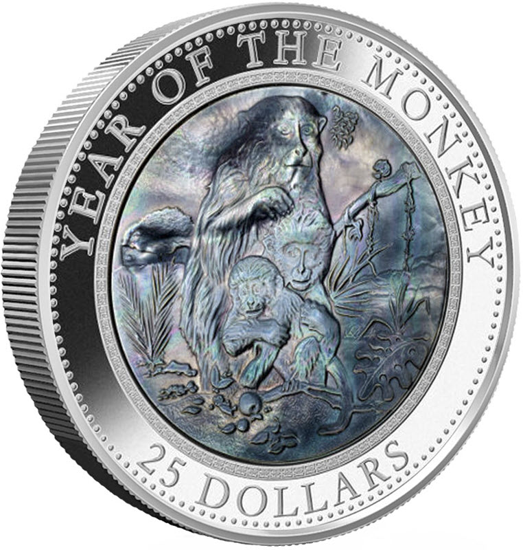 На реверсе изображена семья обезьян, инкрустированная серым перламутром. Вверху вдоль канта надпись: YEAR OF THE MONKEY (Год Обезьяны). Внизу: 25 DOLLARS (номинал).