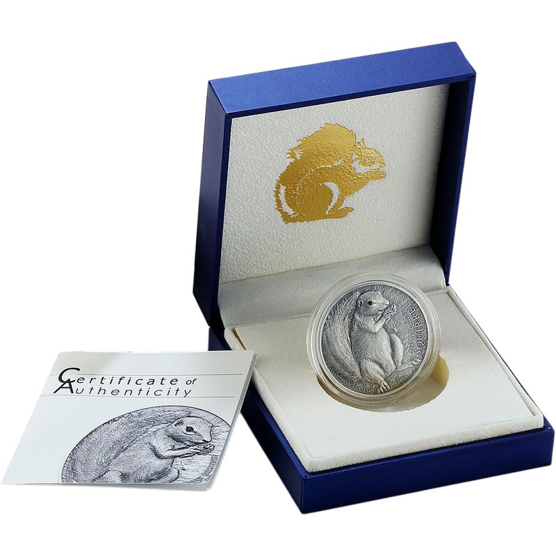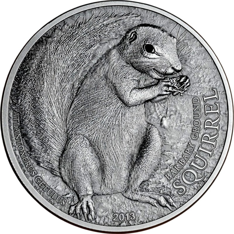 Эта чудесная 1 унцовая серебряная монета из серии «Белки со всего мира» (Squirrels over the World) , посвящена Берберийской земляной белке (The Barbary Ground Squirrel).