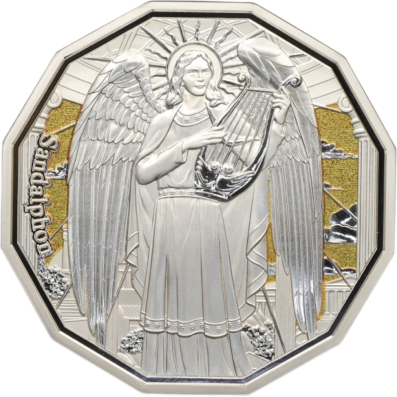 Эта чудесная серебряная монета необычной двенадцатиугольный формы из серии «Знаки зодиака. Архангелы» посвящена Сандальфону - ангелу музыки, покровителю знаку зодиака Рыбы.
