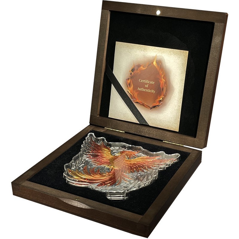 Эта серебряная монета замечательной формы размером 120 Х 110 мм и весом 500 грамм посвящена Фениксу. У нее античная отделка, потрясающий рельеф, выборочное золочение, цветной принт и красные кристаллы. Поставляется в элегантном футляре с сертификатом подлинности. Тираж: 399 штук.