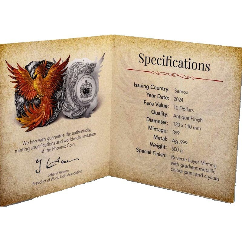 Серебряная монета Самоа "Феникс" 2024 г.в., 500 г чистого серебра (проба 999)