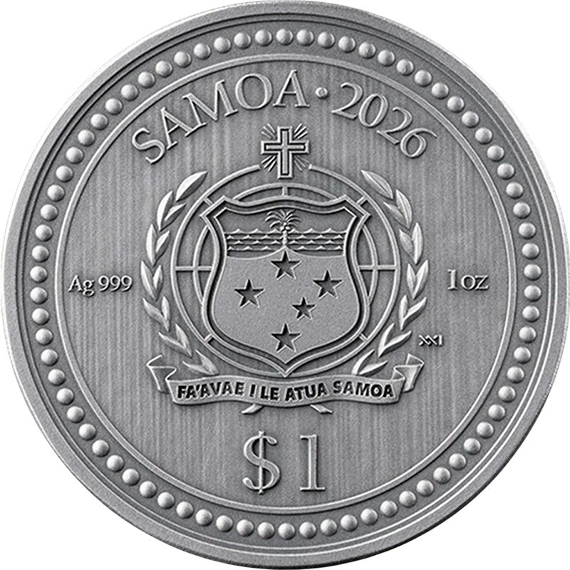 Над гербом надпись: SAMOA ∙ 2026 (страна-эмитент, год чеканки), внизу — 1$ (номинал), слева — Ag 999 (проба серебра), справа — 1 oz (вес серебра).