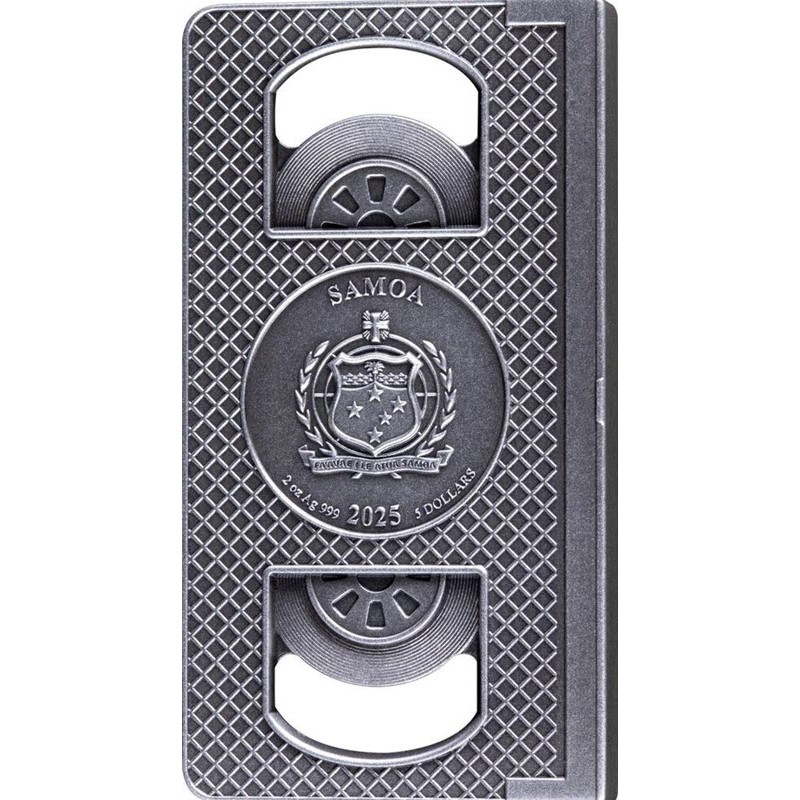 На аверсе изображен герб Самоа. Вокруг герба надпись: SAMOA 2 oz Ag 999 2025 5 DOLLARS (страна-эмитент, вес и проба серебра, год чеканки, номинал). Фоном служит стилизованная VHS кассета.