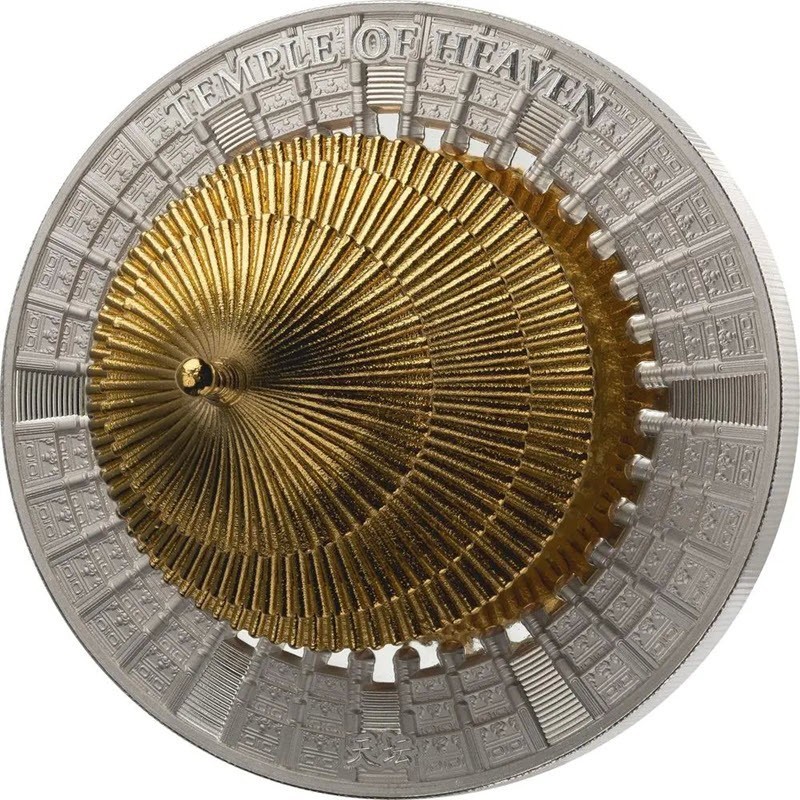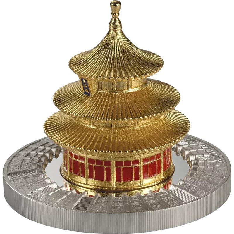 Эта уникальная серебряная монета весом в 3 унции посвящена Храму Неба. У нее 3D-форма с покрытием 24-каратным золотом, селективная окраска и качество пруф. Поставляется в оригинальном футляре с сертификатом подлинности. Тираж: 999 штук.