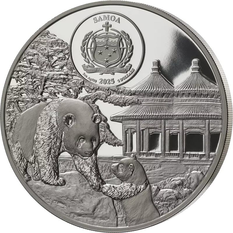 На аверсе на фоне храма и панд изображен герб Самоа. Вокруг герба надпись: SAMOA 3 oz Ag 999 2025 5 DOLLARS (страна-эмитент, вес и проба серебра, год чеканки, номинал).