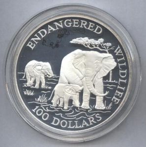 На реверсе изображены три слона на стилизованном фоне саванны, а по кругу надпись - "ENDANGERED WILDLIFE" - дикая природа в опасности, а также номинал.