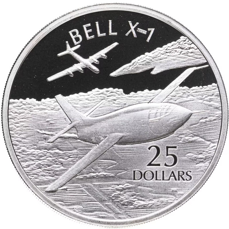 На реверсе изображен полет Белла над облаками. Вверху надпись: BELL X-1, внизу: 25 DOLLARS (номинал).