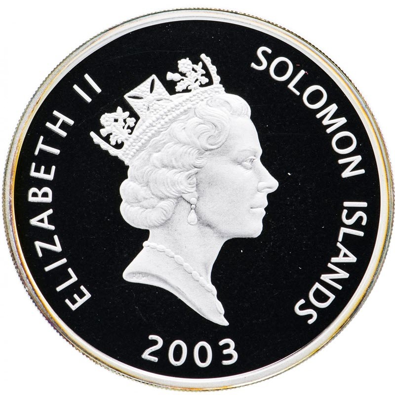 На аверсе изображена королева Елизаветы II с бриллиантовой диадемой и жемчужным ожерельем, дизайнер Raphael David Maklouf (Рафаэль Дэвид Маклауф). Инициалы дизайнера RDM выгравированы крошечными буквами на усечении шеи. Вдоль канта надпись: ELIZABETH II SOLOMON ISLANDS 2003 (Елизавета II, страна-эмитент, год чеканки).