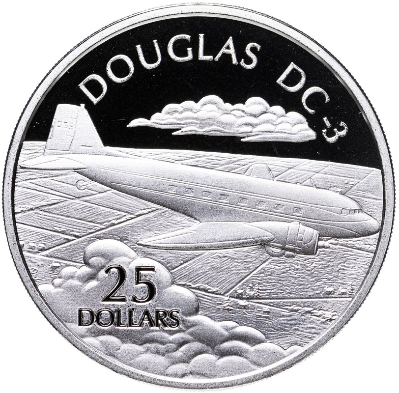 Изображение самолета, летящего над полями. Название DOUGLAS DC-3 и номинал — 25 DOLLARS.