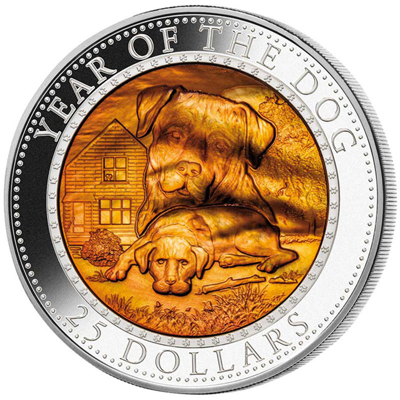На реверсе изображена собака ротвейлер с щенком, охраняющая дом. Вдоль канта надпись: YEAR OF THE DOG 25 DOLLARS (Год Собаки, номинал).