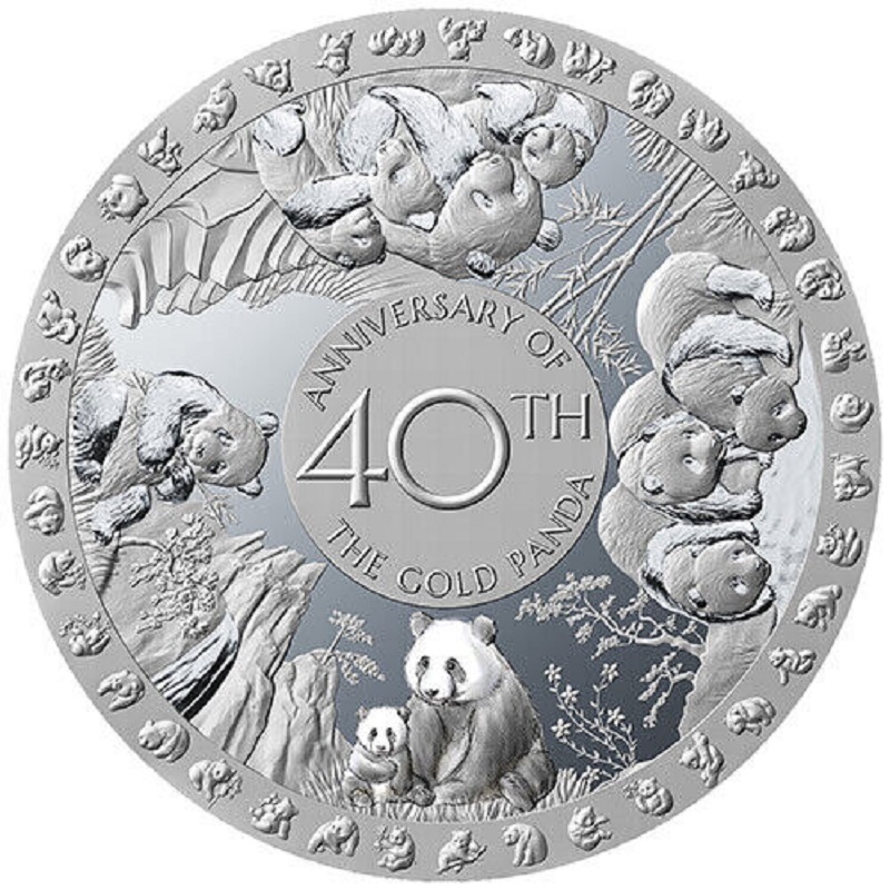 На реверсе монеты изображены все 39 изображений панд с 1982 года. Две панды внизу имеют красивую окраску. В центре надпись: «40TH ANNIVERSARY OF THE GOLD PANDA».