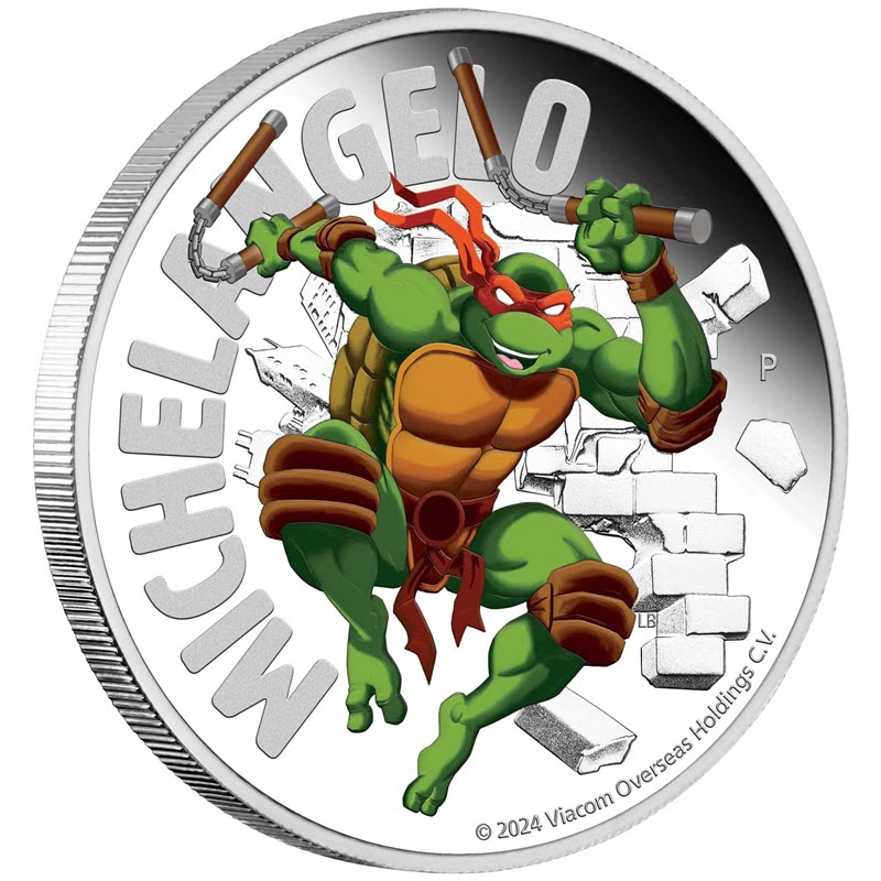 На реверсе изображен Микеланджело в боевом снаряжении с двумя нунчаками. Справа монограмма Пертского монетного двора Р, у колена инициалы дизайнера LB (Lucas Bowers). Слева надпись: MICHELANGELO, внизу вдоль канта: © 2024 Viacom Overseas Holding C.V. (авторские права).