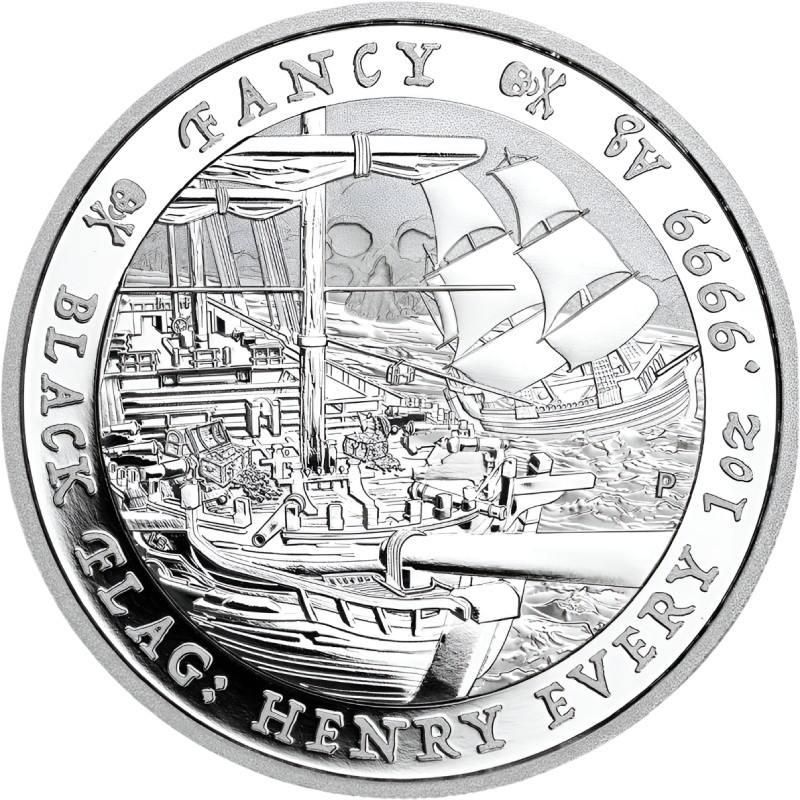 Эта серебряная монета весом в 1 унцию – пятая из серии «Черный флаг» -  посвящена пиратскому кораблю Fancy. У нее качество BU.  Тираж: 15000 штук.
