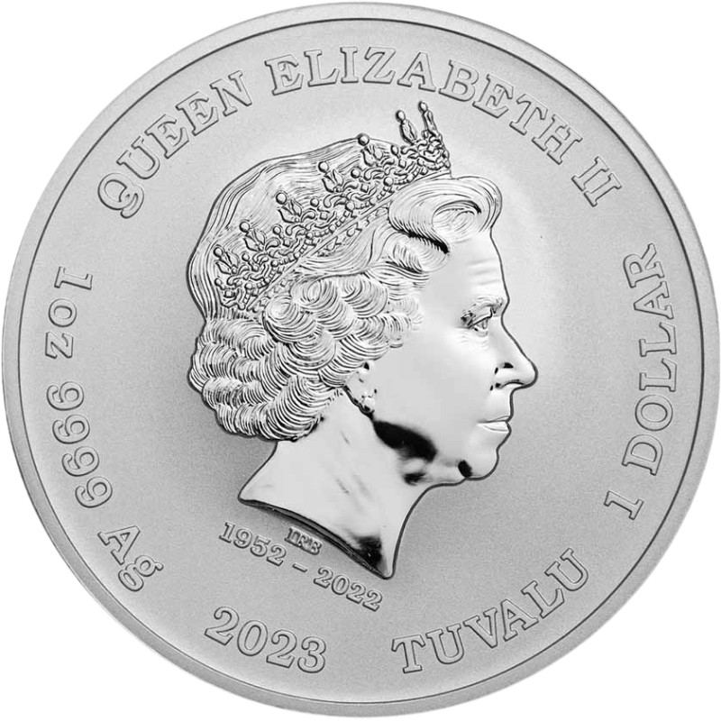 На аверсе изображена Ее Величество королева Елизавета II в бриллиантовой тиаре. Под портретом - инициалы дизайнера IRB (Ian Rank Broadley). Ниже: 1952–2022 (годы правления королевы). Вдоль канта надпись: QUEEN ELIZABETH II 1oz 9999 Ag 2023 TUVALU 1 DOLLAR (королева Елизавета II, вес и проба серебра, год чеканки, страна-эмитент, номинал).