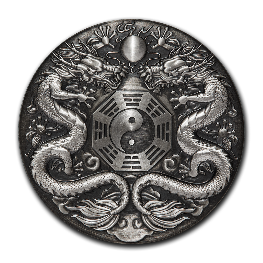 Монета, выполненная в традиционном китайском стиле, изображает двух драконов, которые олицетворяют силу, власть, богатство и удачу. Ограниченный тираж.