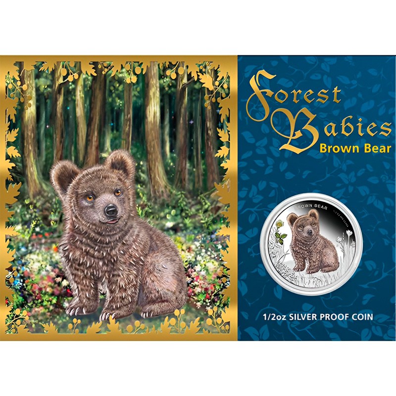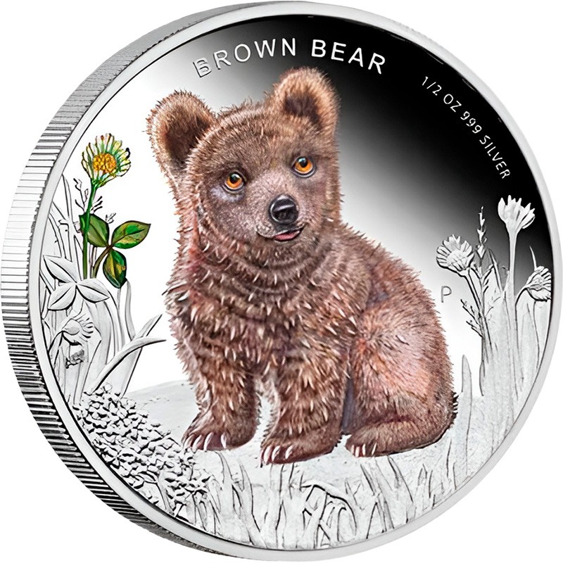Эта чудесная пол унцовая серебряная монета Пертского монетного двора Австралии из серии «Лесные малыши» посвящена детенышу бурого медведя (Brown Bear).