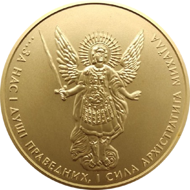На реверсе монеты изображен Архангел Михаил, являющийся одним из наиболее почитаемых библейских персонажей,