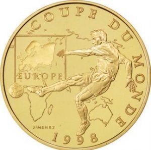 На аверсе изображен футболист на фоне европейского континента, надпись на французском языке по верхнему краю монеты - "кубок мира", внизу указан год - 1998.