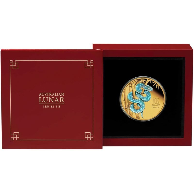 Золотая монета из серии "Лунный календарь - III" от Пертского монетного двора Австралии весом в 1 тройскую унцию посвящена символу 2025 года - Змее. У нее качество пруф и селективная окраска. Поставляется в оригинальном футляре с сертификатом подлинности. Тираж: 188 штук.