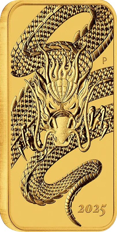 Золотая монета Австралии "Китайский дракон" 2025 г.в. (прямоугольник), 31.1 г чистого золота (проба 9999)